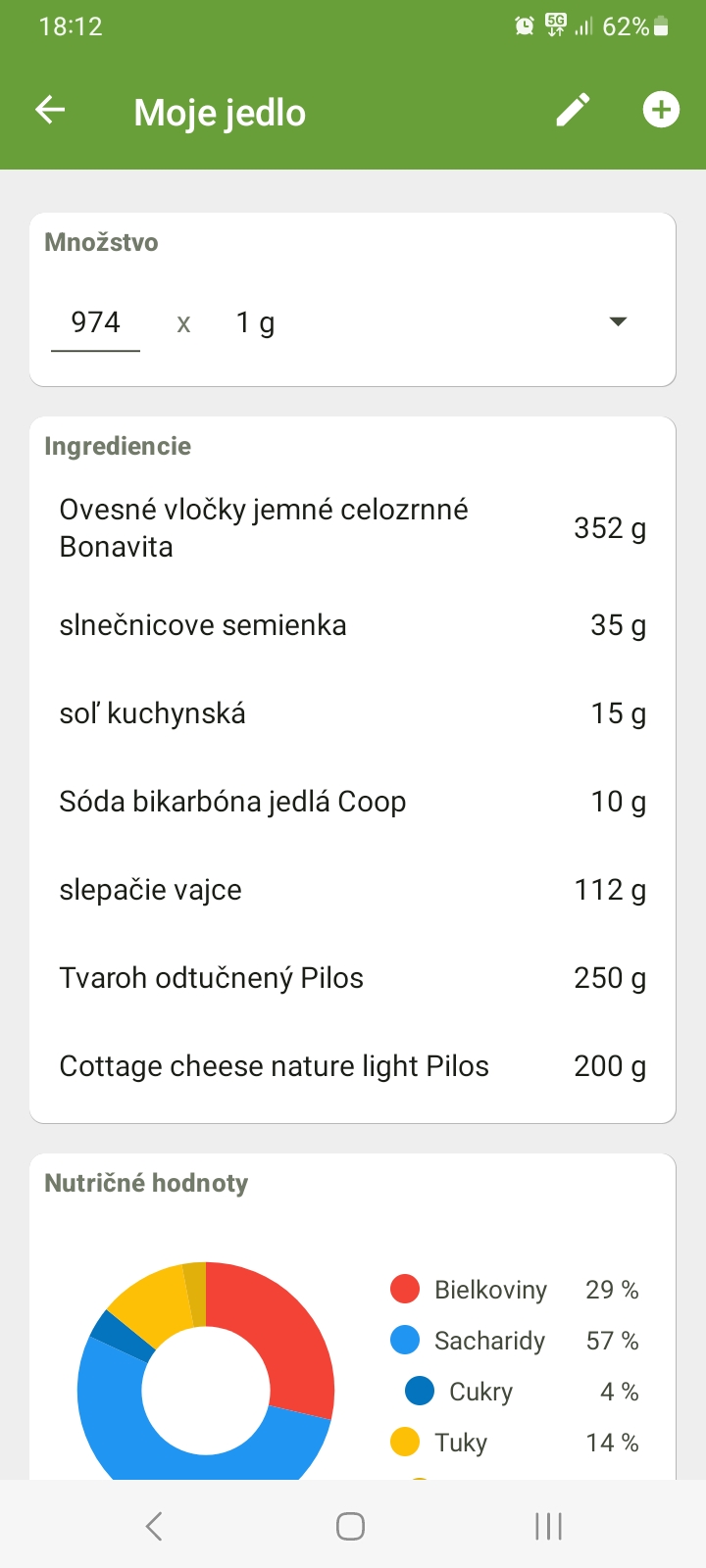 @nevenka podľa mňa je tam tie kopa nezmyslov, ja mám 1405 ale to my píše ako výdaj a nikde nemám ten bazal. A tie hodnoty! Tuky mám vždy cez 150% a nejesť proteín, tak sa ani na 70% nedostanem. A tiež mi tam niektoré jedlá prídu od veci nahodené - tie hodnoty. Keď si robím vlastné jedlo, tak si nahadzujem vlastné hodnoty surových surovín. Ináč mohla by si mi ten recept na tú fazuľku sem hodiť? Vďaka.