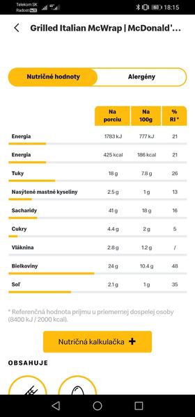 Na mcdonald stránke by mali mať vypísané hodnoty, tam nájdi a opíš si