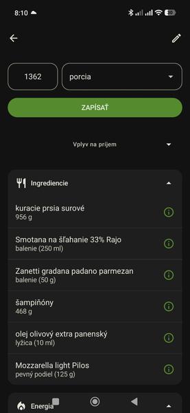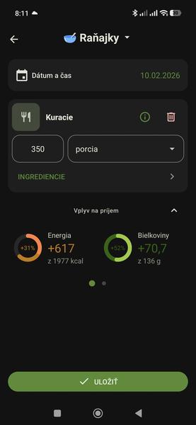 3. takisto funkcia "Moje jedlo" v tomto prípade keďže ide o jedlo ktoré varením mení hodnotu, tak treba odvážiť celkovú váhu po uvarení a zapísať ju ako počet porcií. Následne 1g = 1 porcia.