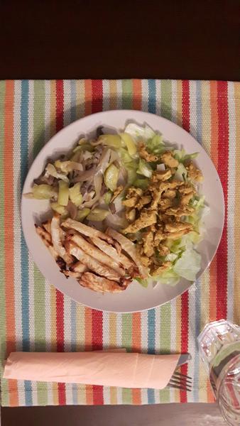 obed - šalát ( cottage, tuniak, uhorka, cibuľka, ľadový šalát) , 1x káva s nízk.mliekom