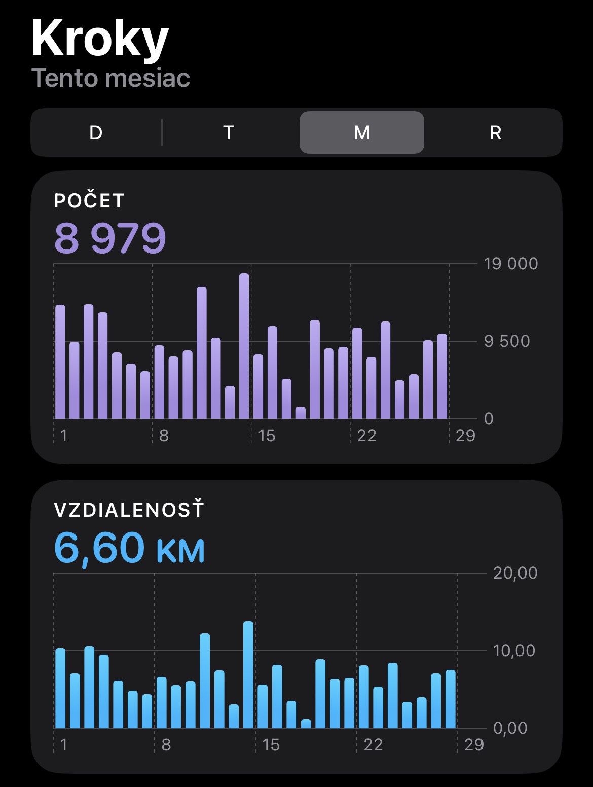 @soulmaya mám sedavé zamestnanie, do práce cca 3km, tento mesiac bol dosť slabý… plus občas sa stane, že mám pol dňa vybité hodinky, takže sa mi kroky nepočítajú. A takýto je môj priemer. Nemyslím si, že práve toto je cesta ako zhodiť (aspoň na mne to určite nefunguje). Určite to chce niečo viac. Ale za seba môžem povedať, že sa cítim lepšie, keď idem napr. ráno pešo do práce.