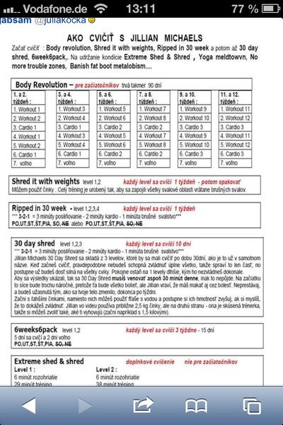 @nair no ja som tiez zacala ako ty ale potom som tu nasla taku tabulku a tam je rozpisane ktore cvicenia cvicit ako prve plus nejake doplnkove cvicenia od nej. V body revolution cvicis dva dni workout potom jeden den kardio potom zasa dva dni workout a zasa jeden den kardio a den volno. Tue dva workouty su kazdy iny a cvicis ich dva tyzdne potom ides na iny workout. Cardio je tusim prvy mesiac to iste.