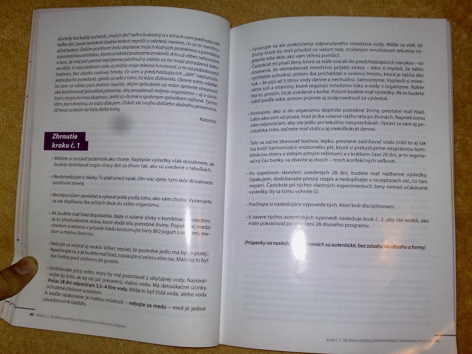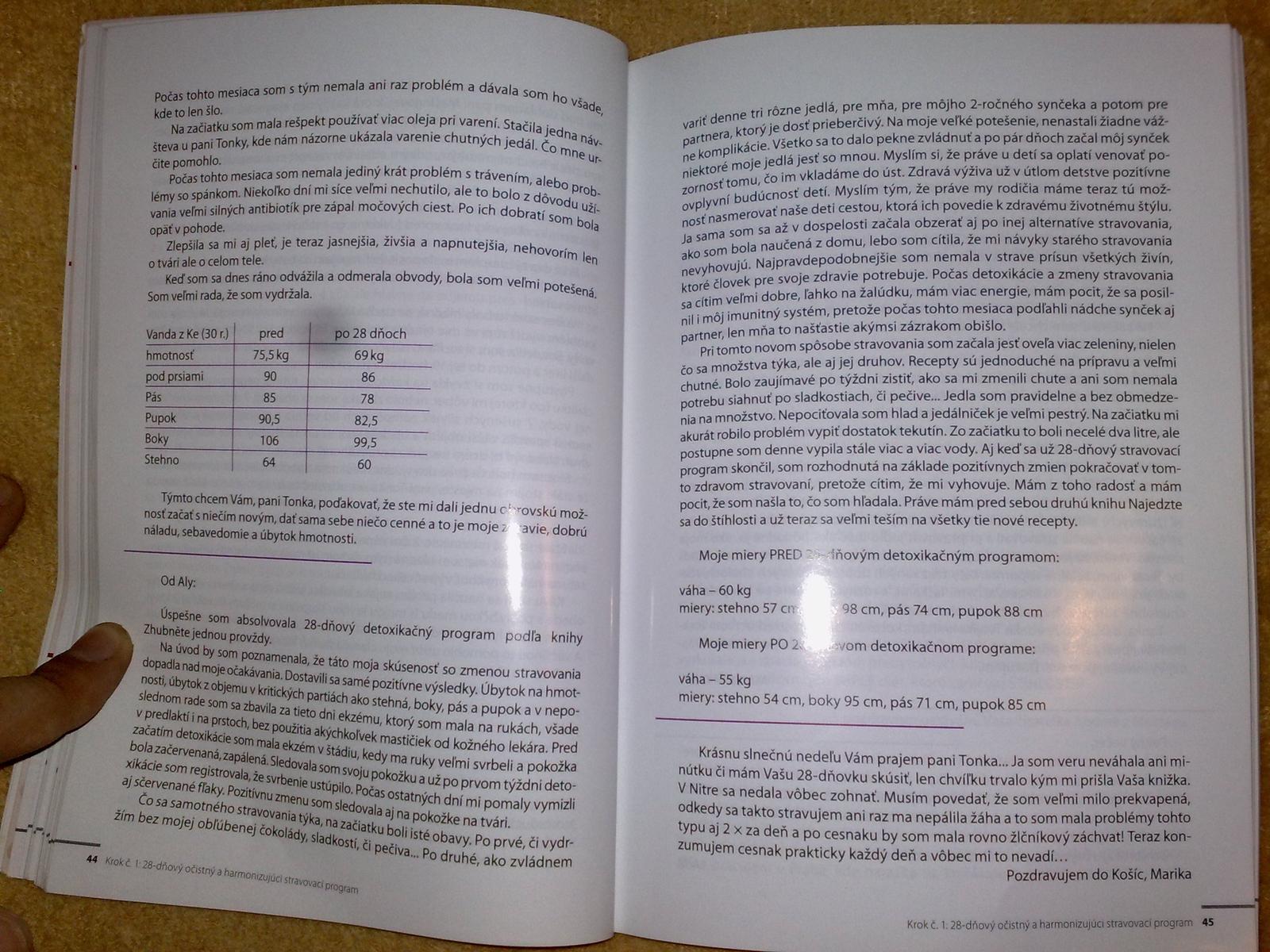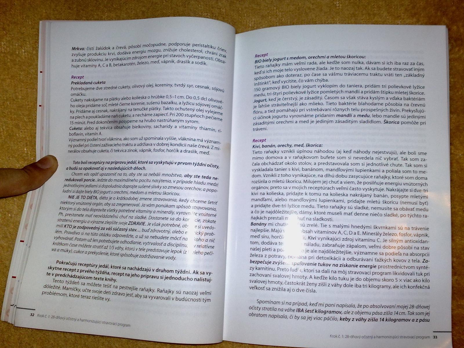 ahojte , ja som to urobila celé, aj následné stravovanie. dokonca niektoré recepty používam a mám obľúbené dodnes, ale musím povedať, že jediná výhoda pre mňa spočívala v lepšej pleti, naučila som sa piť dostatok tekutín. očakávala som, že pôjdu dolu aj kilá, ale to sa nestalo. je pravda, že nemám nadváhu, stravujem sa celkovo zdravo a racionálne celkovo, takže asi nemuselo ísť dolu nič.