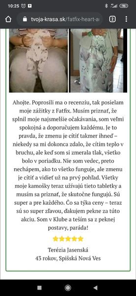 @merlin796 Musím povedať, že toto je prvý prípravok, z ktorého som schudla, a pritom som ani necvičila, naopak, sedela som za počítačom, dokonca som aj maškrtila sladkosti. Sama som bola veľmi milo prekvapená -- za 1 mesiac som schudla 7,5 kila, a hneď si idem objednať ďalšiu várku. Naozaj píšem pravdu! Začala som s 89 kg, a dnes mám 81,5 kg. Môj cieľ je 70 kg. Dúfam, že sa mi to vydarí!