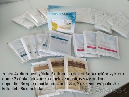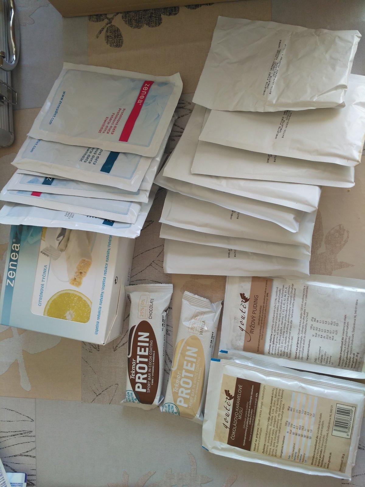 Dievčatá predám balík proteínové diéty,nevyuzijem už,schudla som a otehotnela 🙂) pridávam foto,je to mix najucinnejsich diet,n nakoľko som nechcela zvykať na jednu chuť,striedala som. Je tam 2x goute cokoladovovisnovym karamelové mušlí,1x ryžový puding,potom zenea: 7x citrónová tyčinka s polevou z bielej čokolády,2x tiramisu dezert,4x šampiónov krém,potom sáčky bielkovinové diéty: 8x omeletas hubami myslim a ešte dve proteínové tyčinky k tomu. Cena za komplet 55€ s poštou