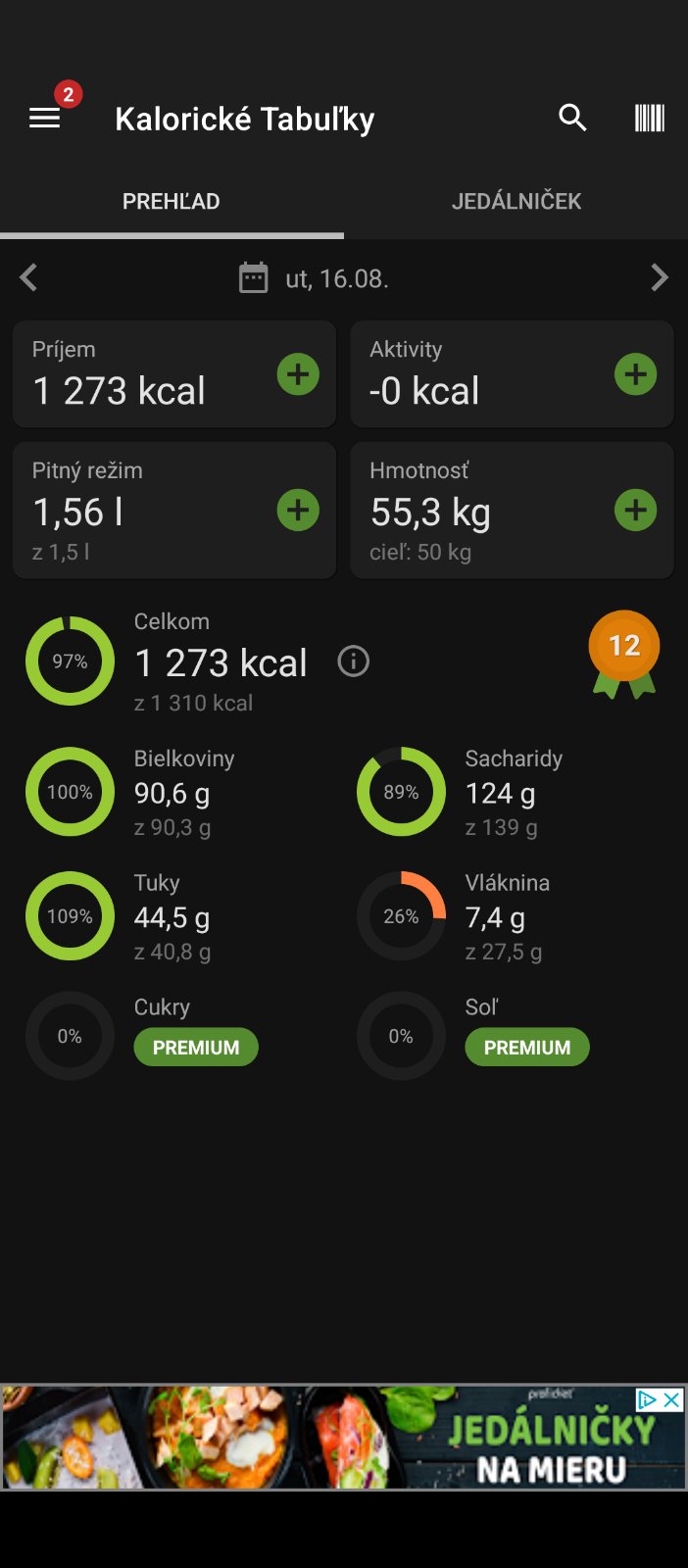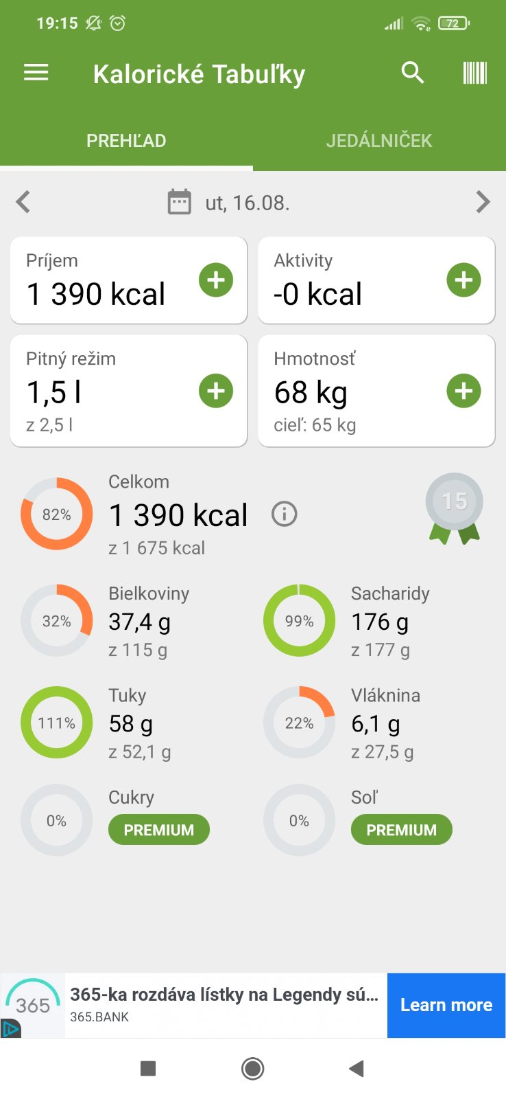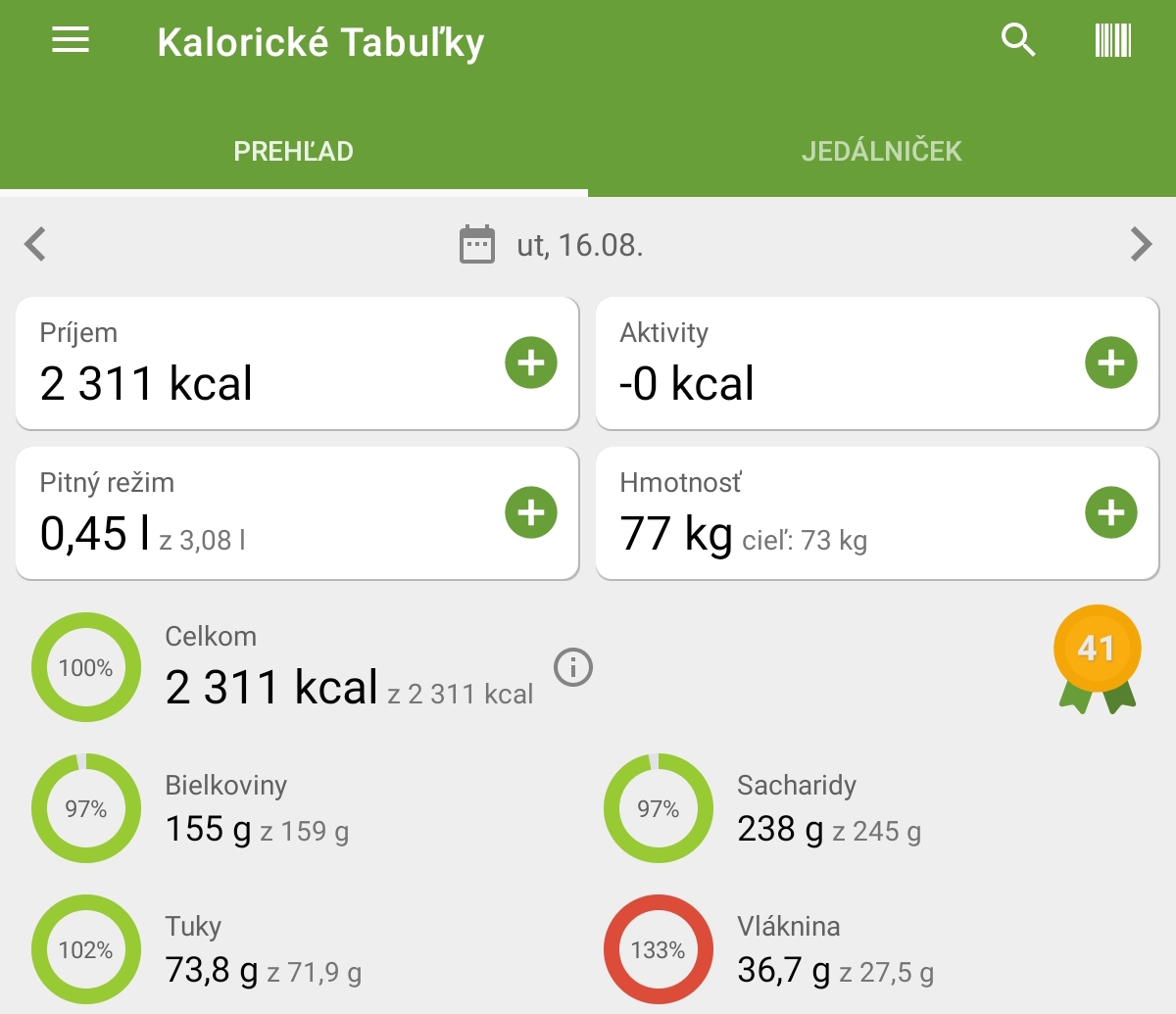 @usagin124 - Necvičim preto to mám nastavené na mierny režim tam mi vyšlo 1310kcal tak to dodrziavam nech je vždy zelené koliesko a nech to není cez 100% Pod bazal nejdem. Hodnoty makier mám podľa KT doteraz som mala bielkoviny ledva 1g na kg hmotnosti teraz to mám o dosť vyššie ale tak všade píšu čím viac bielkovín tým lepšie 🤷 konečne mám bielkoviny na zeleno nie oranžovo ako doteraz tak to snáď nemôže byť tým