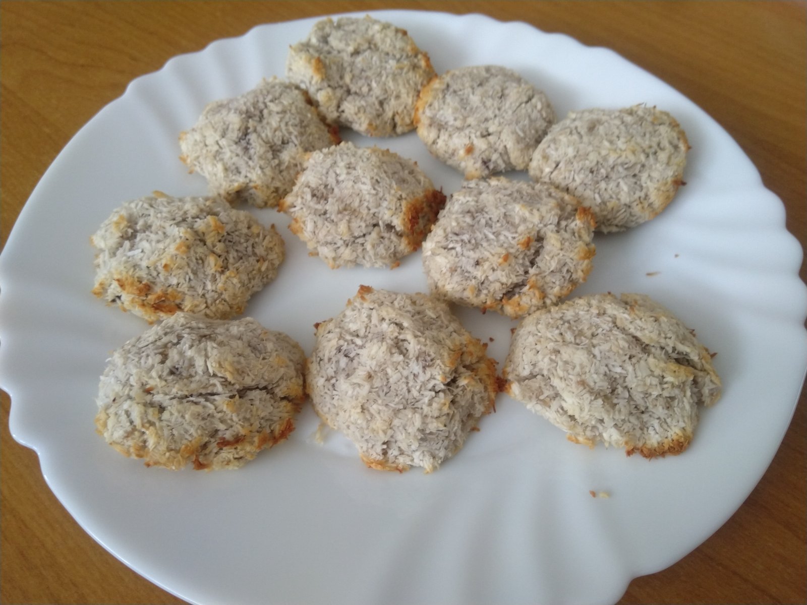 Dnes som skúsila jednoduchý recept. Roztlačený banán 1/2salky. Potom1salku kokosu. Premiešať, urobiť kôpky a upiecť na 180stupnov na 6min. Dávala som na papier na pečenie. No neviem koľko kcal, lebo som si zabudla kokos odvážiť. Podľa info na nete som si to zapísala a na 1ks mi to vychádza 40kcal, bielkoviny 0,4g, sacharidy 2g, tuky 3g.