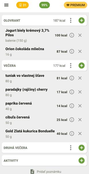 Zapisujem všetko, jedlo si robím doma, vážim každú surovinu. Prikladám foto zo včera, kalórií dokopy 1466, cieľ kalórií splnený na 99%. Pijem len čistú vodu a nesladeny čaj, ráno kávu s mliekom a cukrom, to tam mám zapísané (zapisujem zvlášť mlieko a cukor, samotnú kávu nie, to nemá žiadne kalórie). Takto sa najem dobre, ale vydržať medzi jedlami mi je občas dlho a zjedla by som kľudne aj viacej, nie som úplne dosýta najedena. Neviem si predstaviť jesť ešte menej. Rada by som si občas dopriala aj trochu sladkosti, alebo také normalnejsie jedlá ale keď som to pár krát skúsila tak už mi na večer nevyšli žiadne kalórie a bola som hladná, tak sa mi to moc neoplatí.
