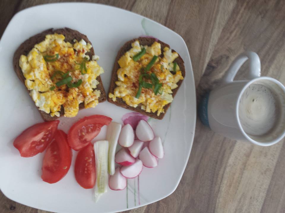 Dobre ranko 🙂 moje fajnove ranajky 2 chlebiky (razna muka 100%) prazenica z 2 bielkov a 1 zltok, zelenina + kaffe 🙂
