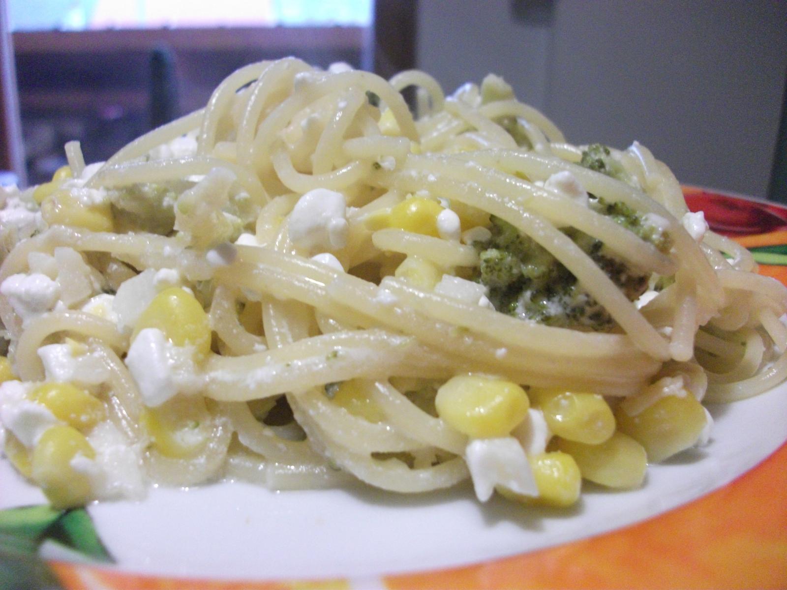 tak po včerajšej debate o pangasovi som ho nechala odpočívať v mraziaku a zvolila som na dnes takýto obedík: semolinové špagetky,troška oleja,kukurička,brokolica a cottage - mňamky 😀 😀 😀 😀