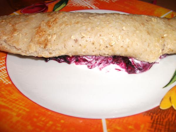 dnešné raňajky - placka z ovsených vločiek plnená tvarohom a džemikoma špagetky na obed
