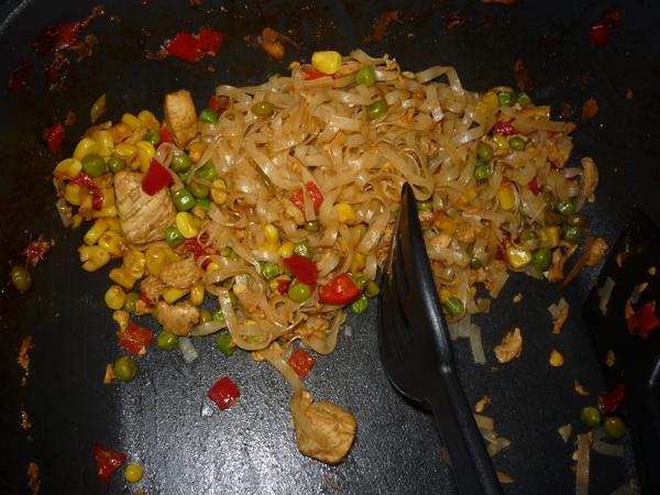 Ryžové rezance namočíme do studenej vody na približne 30 minút. Tento bod je fintou číslo jeden. Môj predošlý pokus o toto jedlo stroskotal na tom, že som sa pokúšal cestoviny variť. Hoci len kratučkú chvíločku cca 2 minúty, aj tak sa pri následnom praženi vo woku rozvarili. Keď cestoviny namočíme do studenej vody mierne zmäknú a pri pražení sa takmer okamžite uvaria vo vode ktorú absorbovali. V receptoch na internete sa udáva, že cestoviny stačí namočiť na 10 minút, ale pri type cestovín, ktoré som mal k dispozícii ja, to nestačilo. Boli stále veľmi tvrdé, suché a zlepené.