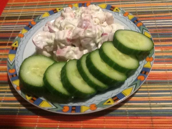 Ahojte! Na obed som mala mňamku- bravčové karé pečené na kyslej kapuste - kapusta bola potom aj samotná príloha. Bolo to ohromné. No a teraz na večeru - šalát z krabích tyčiniek- s redkvičkou, pórikom s trochou majonézy "light" zmiešanej s nízkotučným jogurtom plus uhorka. Prikladám foto. 🙂 No a pred večerou som sa "zničila" na bežiacom páse- 45 minútový fartlek (striedanie rýchlostí). 😀