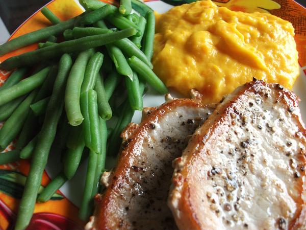 O zemiakovo-mrkvové pyré + prsia na panvici