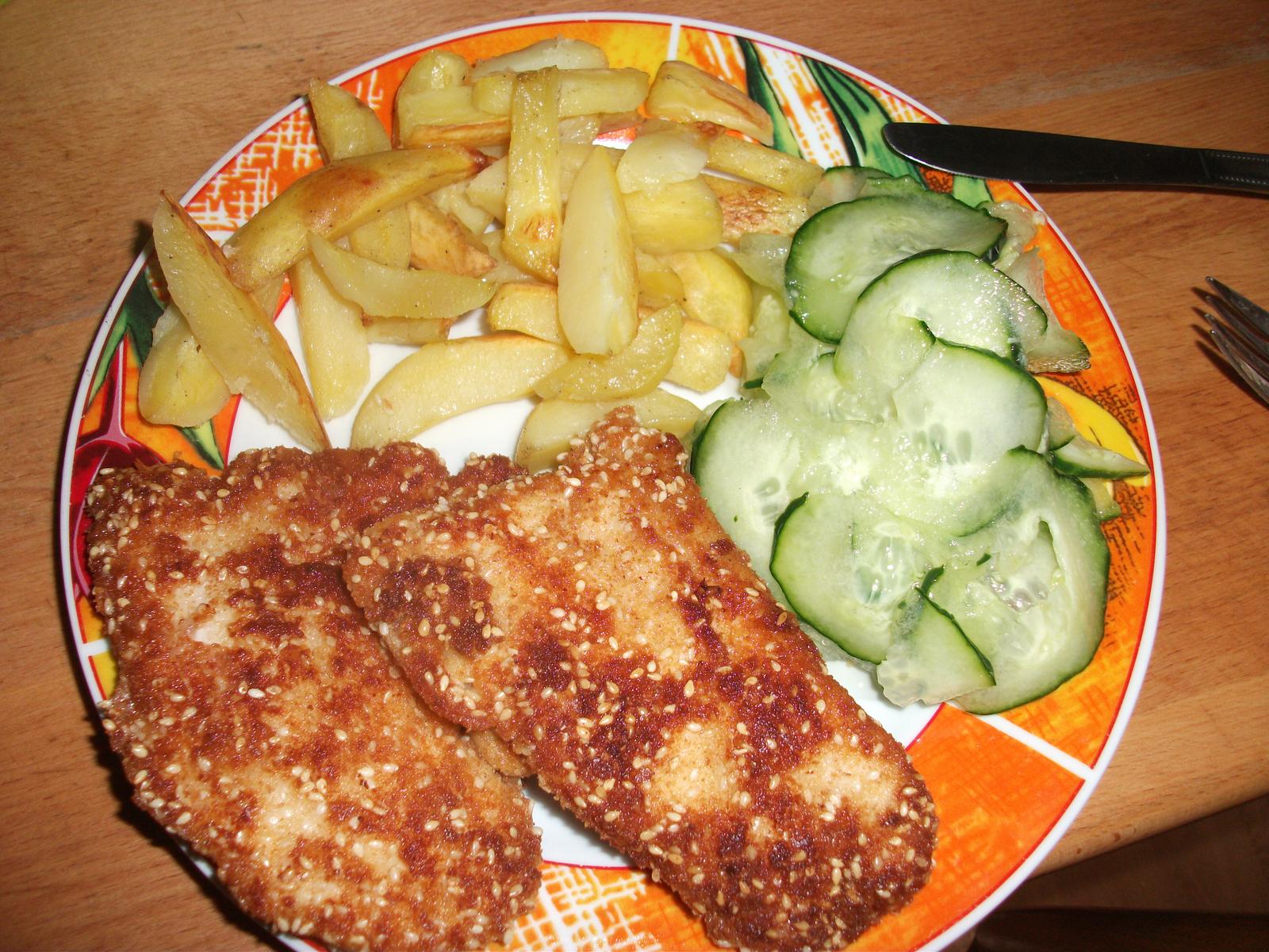 nedelný obed mala som strašnú chuť na niečo klasické, takže kuracie prsia v 3 - obale (graham. strúhanka a sezam), pečené zemiačky, uhorkový šalátik