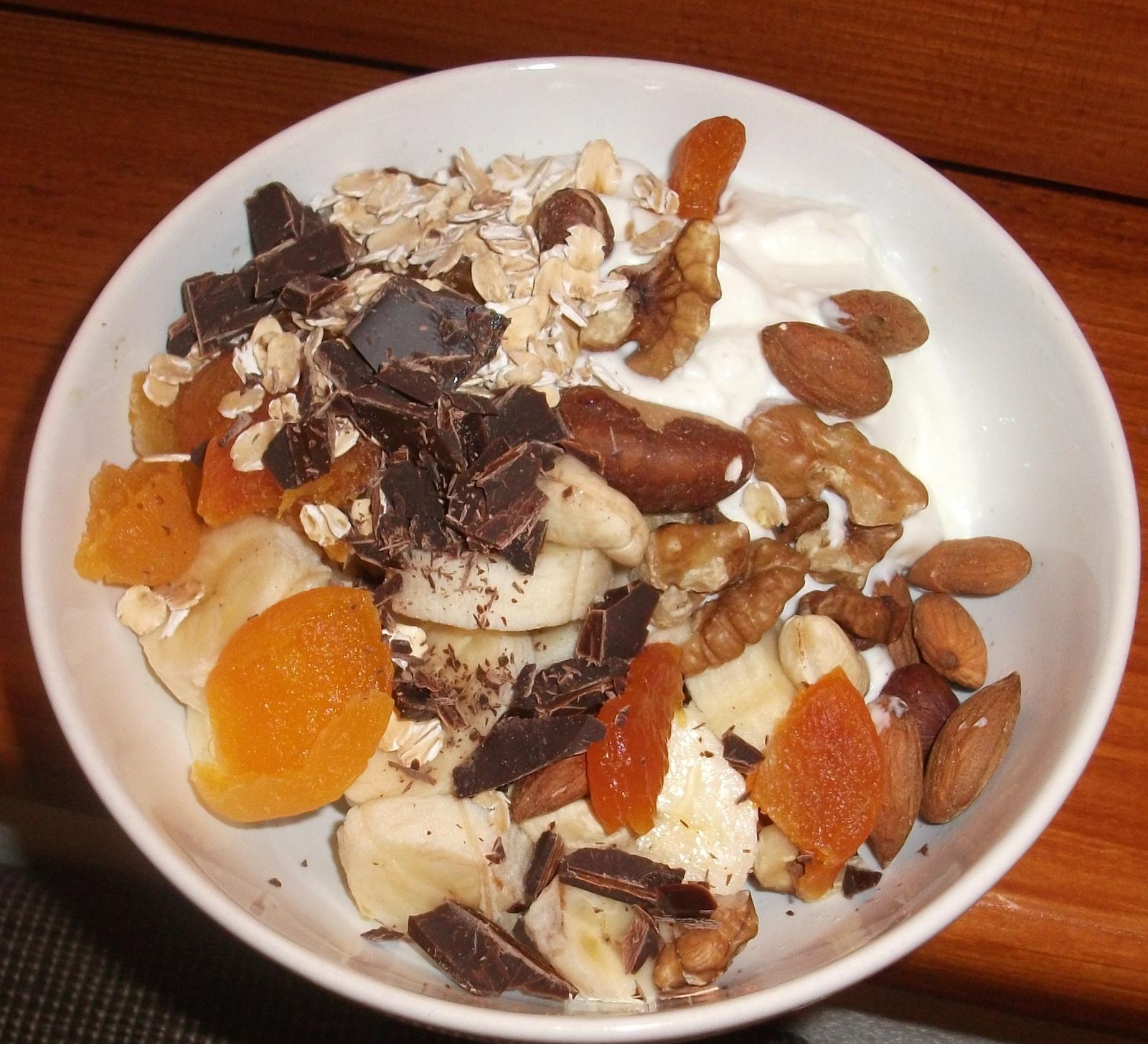 jogurt s banánikom, orieškami a sušenými marhulami - ranajky