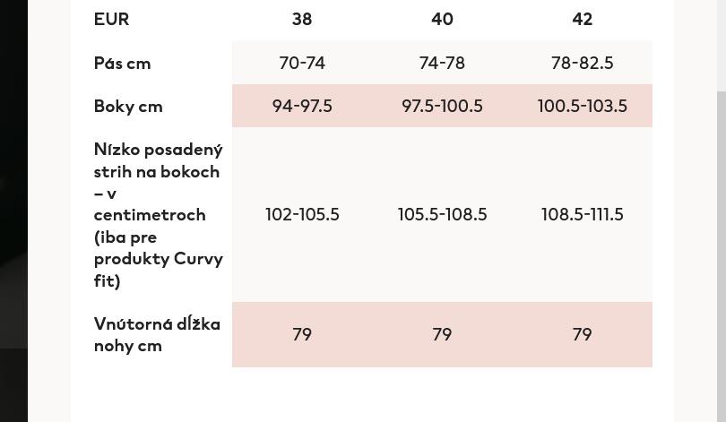 @pupavka234 pozeram tie velosti a teda velkost L ma boky 103-110. velkost 44 ma boky 103-106a 46 ma boky 106-110.