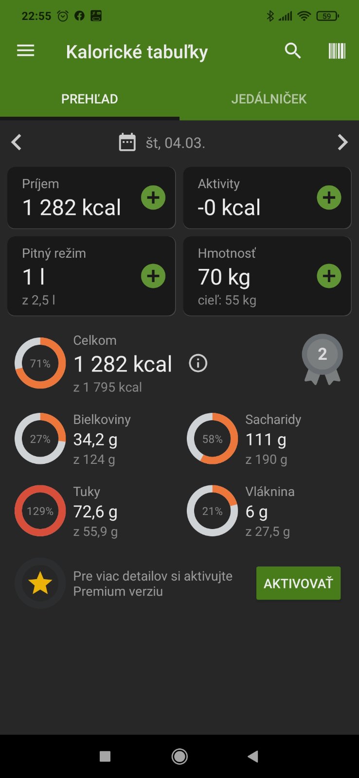 Co sa tyka tych kalorii, ktore ti Kaloricke tabulky odpocitavaju za aktivitu je to nepresne, ja si to napr. vobec nenahadzujem, nema to moc zmysel, lebo je to casto nadhodnotene. Nie je trening ako trening a tie spalene kalorie su casto mimo aj na vsetkych fitnaramkoch a smarthodinkach. Velmi dolezite pri zhadzovani tuku je co robis, ked prave necvicis - ci sedis napr. za PC alebo chodis alebo pracujes fyzicky...vstupuje do toho velmi vela faktorov.