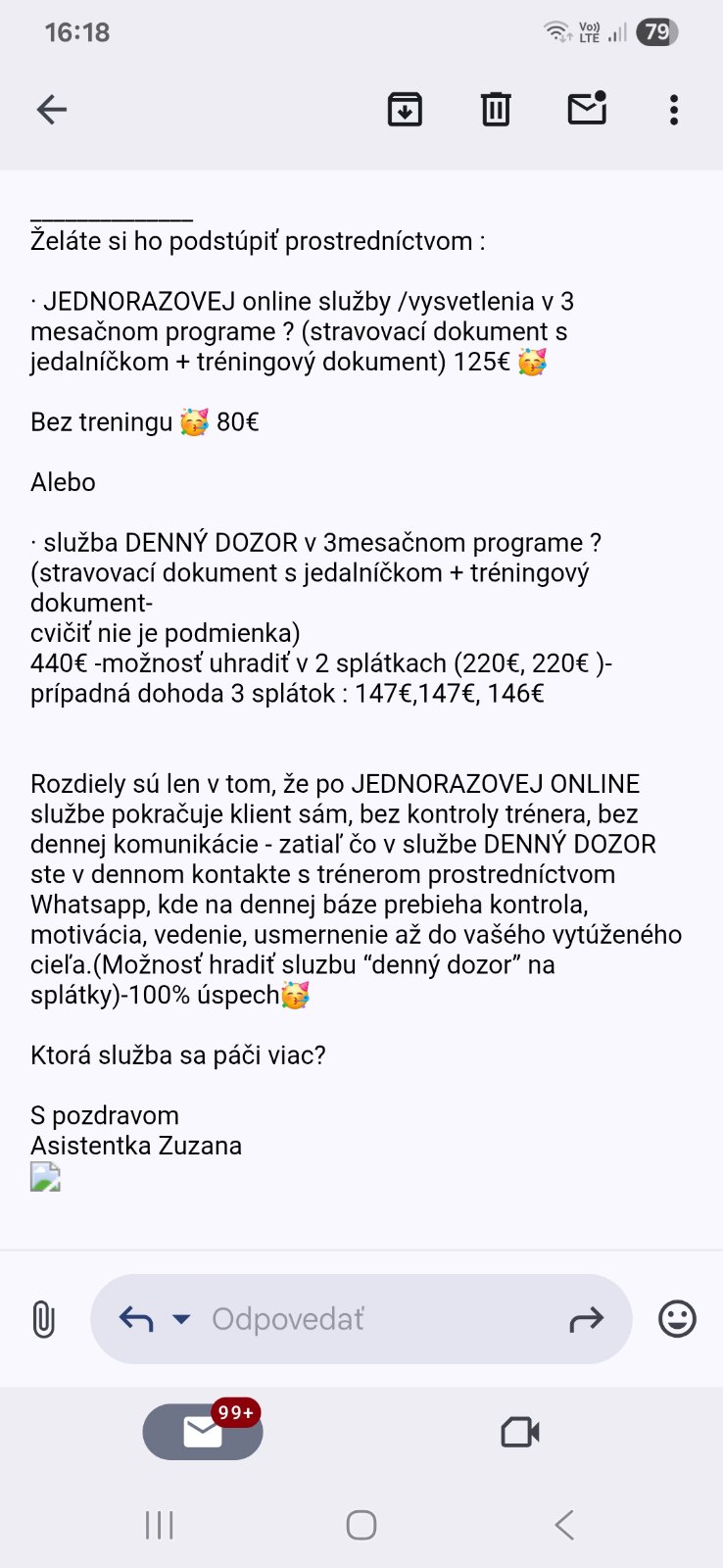 @julyl prečo by som mala klamať? takúto informáciu mi poslal do správy s možnosťou platby na splátky. Neopýtal sa ma vôbec na nič, poslal rovno cenník a zaujímalo ho len kedy začneme. Za to ja som sa vypytovala celkom dosť. A keďže som nedostala odpoveď na moje otázky, rozhodla som sa do toho neísť. Toto je moja skúsenosť, prečo by som ju nemohla zdieľať? Ja nie som neúspešná, nie som ani tučná. Vždy som sa hýbala okolo 50kg a po opakovaných potratoch a pôrode v 38 rokoch som ostala na váhe 58kg. Teraz mám o čosi viac, no vždy som na tom pri 165cm tak akurát. Jediné, čo mi vadí je tuk, ktorý sa mi vďaka hormónom a predmenopauze ukladá na brušku. Preštudovala som si na nete základné informácie a nastavila si jedálniček sama. Za mesiac som zišla dole o kilo a pol.