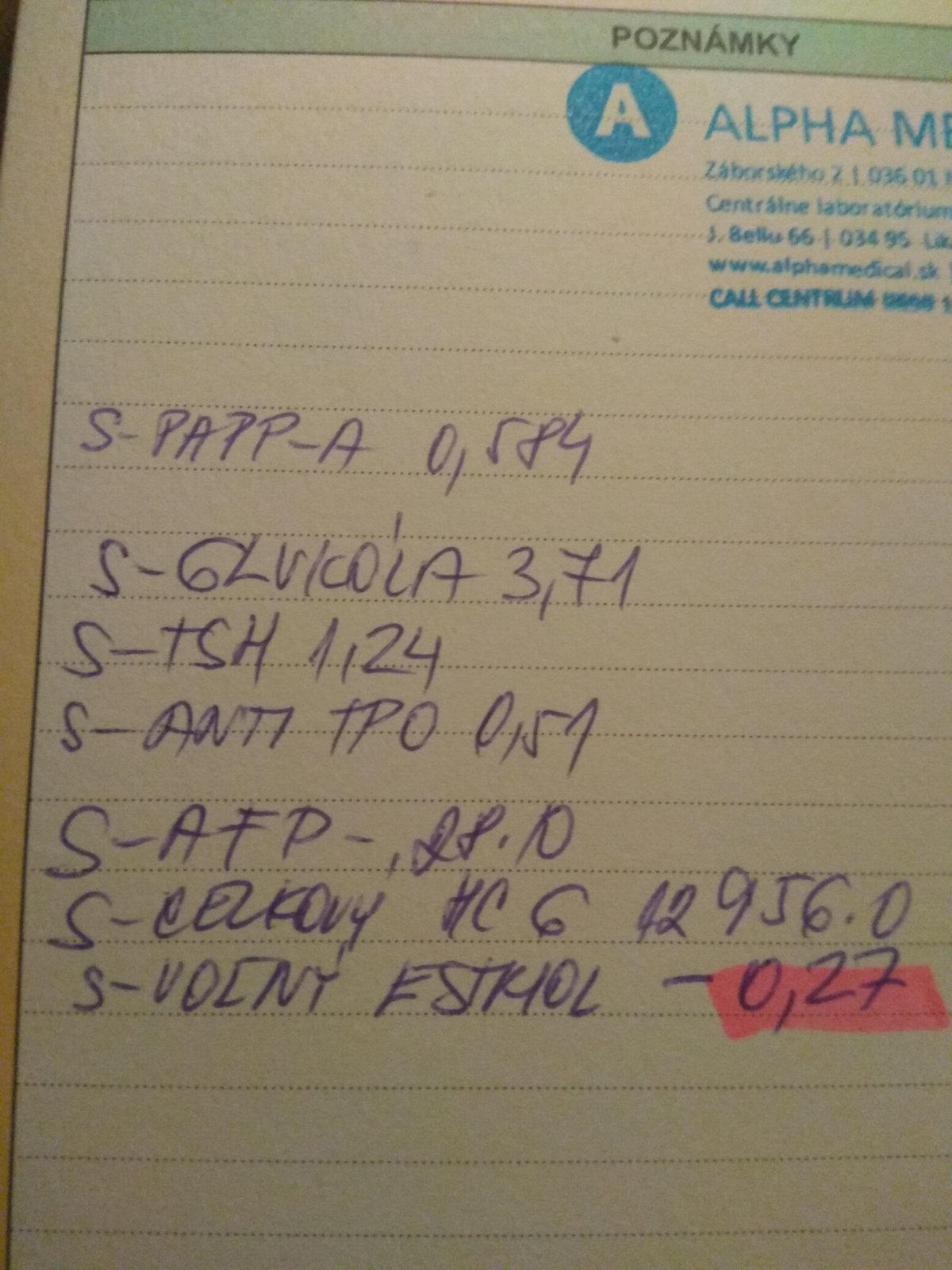 @lina1992 ako si prosim dopadla.. mam velmi podobne vysledky testov, tiez nizky estriol.. celkovo testy vysli dost zle, v pondelok idem na genetiku