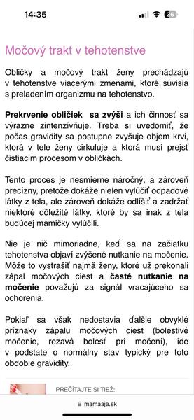 @betka1_41 prikladam len clanok z popularneho mamickovskeho webu… moze to byt uplne normalne aj na zaciatku tehotenstva a moze to byt aj uroinfekt a prave preto je potrebne vysetrit moc, inak sa to odlisit neda. Nerozumiem preco ti lekar nedal vysetrit moc papierikom, trva to asi dve minuty aj s pripravou a papieriky ma v ambulancii kazdy (ak teda nevysetril kedze si nenapisala ci ano ci nie). Dokonca sa daju kupit v lekarni aj domov.