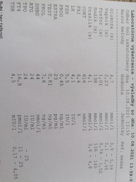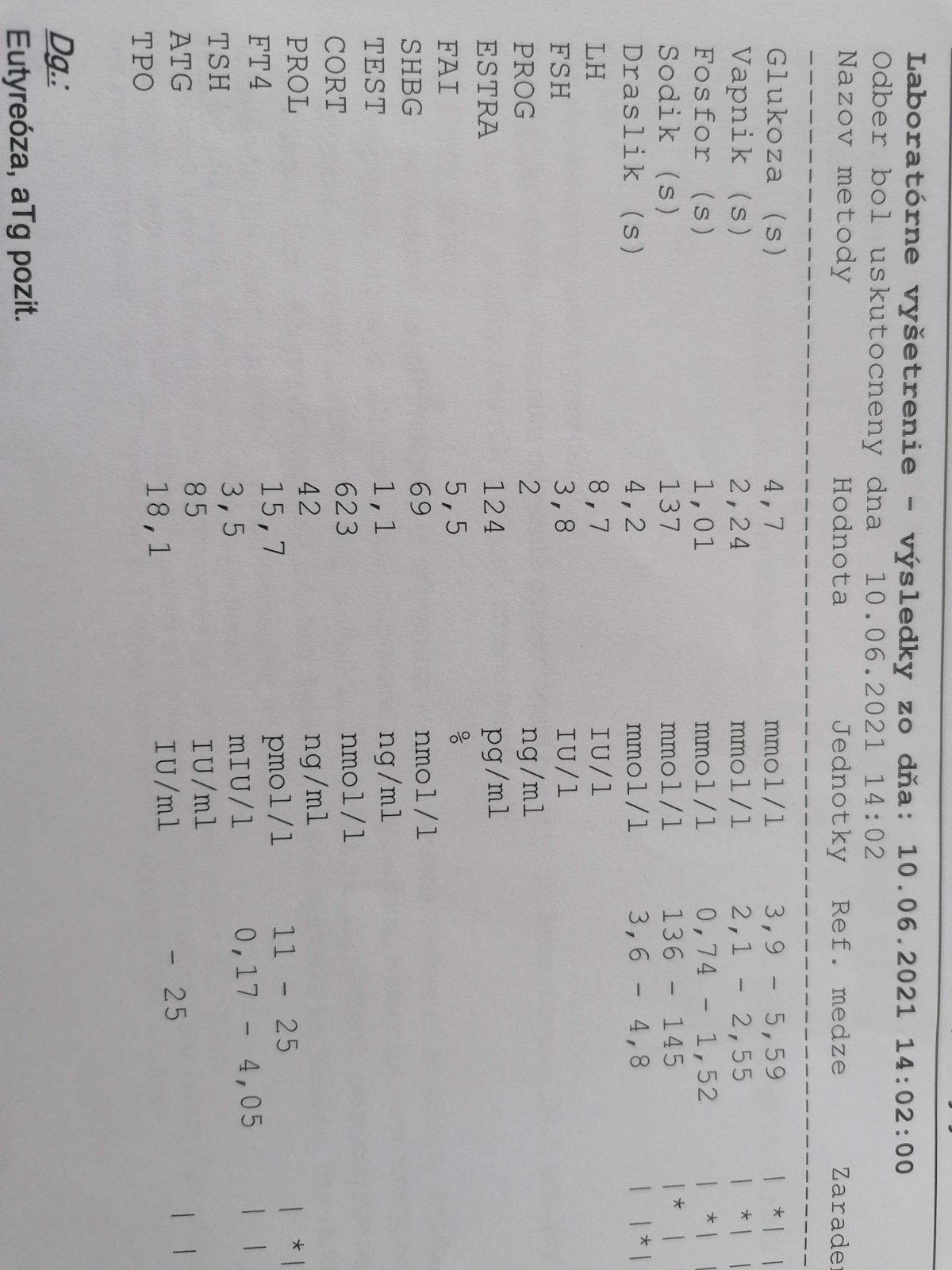 @hmmm71 ahoj, dnes som bola na kontrole na endokrinológii... Už ma to hnevá, zase musím ísť k nim na kontrolu o 3 mesiace 😥 prvý odber mi brali 3 týždne po pôrode a mala som vyšší prolaktín a testosterón... Teraz mi brali odber 3 deň menštruácie, prolaktín a testosterón ok, ale vyskočila mi vraj štítna žľaza, vraj to bežné vyskakuje pri strese, nachladeni ci menstruacii... Lekárka mi vravela, že výsledky nenasvedčuju žiadnemu ochoreniu, ale chce to skontrolovať o 3 mesiace... Ja tým hodnotám nerozumiem, už som z toho na nervy... Ty rozumieš mojim výsledkom? Dávam tu fotky hodnôt z oboch odberov