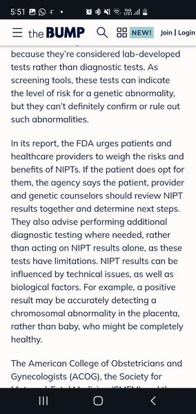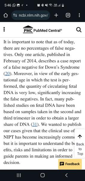 Dalsie zdroje vratane americkeho uradu sa zamerali na to, aby preskumali relevantnou a masivnost pouzivania tychto neinvazivnych metod, dopadom a vplyvu falosnych vysledkov a zistili, ze sa maju naozaj zacat pouzivat opatrnejsie prave kvoli tomu, ze je omnoho viac falosnych vysledkov nez 99% (aj negativne aj pozitivne) a preto zeny uz viac nejdu na invazivnu - amniocentezu (riziko ohrozenia plodu 0,8%), ktora vsak omnoho spolahlivejsie ako tieto testy vyvracia falosne vysledky a tym padom sa oslabuje ochrana pacientok - skippnu amnio lebo sa definitivne spolahnu na nipt (v skratke). Oficialne studie ktore sa kriticky vyjadrovali svojimi nalezmi, zisteniami k falosnosti nifty + info je vela, treba to popozerat detailnejsie.