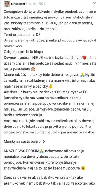 @anjelikdianka ahoj. Viem, že na toto sa nepýtaš, ale - dnes od rána mám v hlave a srdci toto video. A keďže tu máš reakcie "je mi ľúto "bohužiaľ "musíš na amniocentézu... - prezdielam ti ho sem. Mám 10 mesačnú dcéru, tak úplne živo cítim tú obrovskú vzájomnú nehu, radosť v situácii ako na videu. Ďalšia mamina, ktorá vraví "keby som sa mohla vrátiť späť do chvíle, keď mi oznámili diagnózu, plakala by som, ale tentoraz od stastia. Nečítajte všeobecné informácie ale konkrétne príbehy." Ako aj tu na koňovi som viackrát čítala odpovede od žien, ktoré majú dieťa s DS (niektoré som si spravila screenshot presne pre situácie, kedy môžu byť povzbudením pre ďalšiu maminu)... S otázkami je podľa mňa dobré obrátiť sa na laicke poradkyne z platformy rodín (maminy s dieťaťom s DS). Prajem ti veľa pokoja a radosti s tvojimi deťmi 🙂