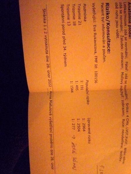 @mojsyncek Trisomia 13 - 1:277 znamená, že jedna žena z 277 s Tvojimi parametrami (výška, váha, fajčiarka, výsledky krvi, namerané hodnoty výsledkov a iné) na svete/v Európe? bude mať postihnuté bábätko touto poruchou, je to čisto len pravdepodobnosť, mne lekár povedal, že tie testy by sa už nemali robiť, pretože len zbytočne stresujúce ženy. Dúfam, že som to nepoplietla, ale mne to bolo vysvetlené tak...