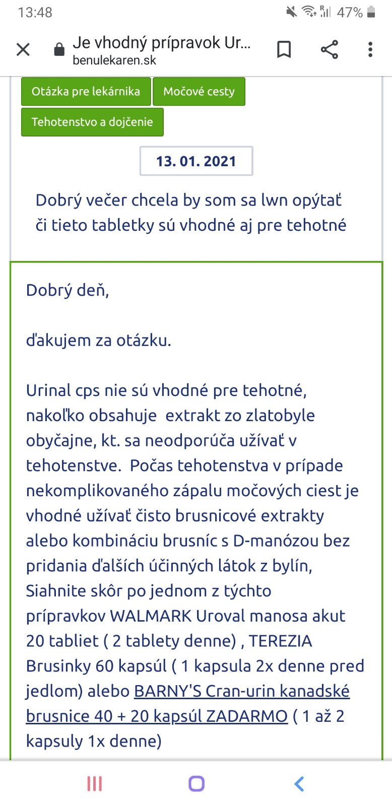 Dobrý deň chcela by som sa poradiť som tehotná a pár dní ma bolí pri močení nie je to ale nejaká veľká bolesť ,volala som aj obvodnej a nedvíha mi tak som zašla do lekárne a odporučil mi urinal akut forte vraj je vhodný aj pre tehotné ale teraz som zasa čítala na internete že vhodný nie je jednu tabletu už som vipila☹
