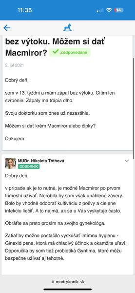 Prikladam odpovede od dvoch roznych gynekologov.. Ja by som skusila najprv ten test, vyplachy(Rosalgin, Clogin..) a/alebo probiotika a riesila potom ten ster. Ale teda neliecena infekcia (ak by naozaj slo o infekciu) je asi horsia ako Macmiror.