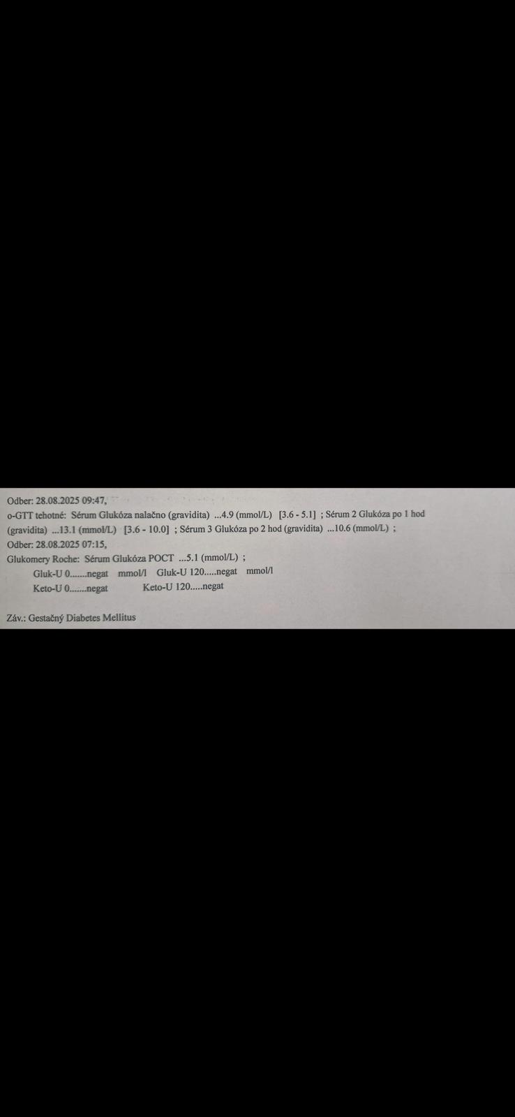 Dobrý deň prosím vás su to velmi zle výsledky ešte stale som v šoku minuli týždeň som bola na tehotensku cukrovka 25 tt tehotenstva. A mala som zvýšené akurát som od doktora prišla ten mi dal aj systém na meranie hladiny glukózy v krvi na samotestovanie, že si to mam 3 krát denne robiť pichnúť stou ihlou do prsta a merať. A zapisovať si zakaždým.