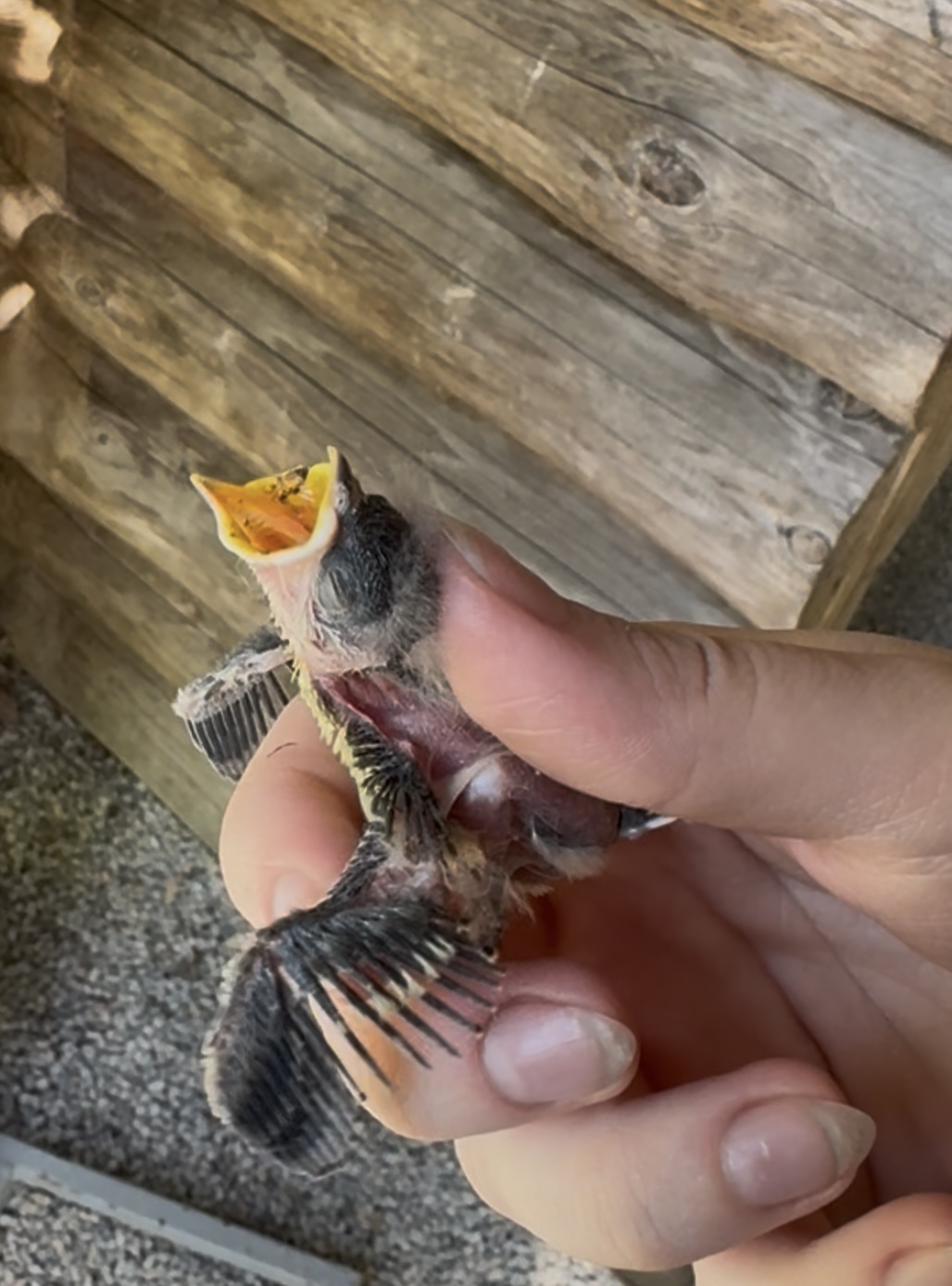 Hm, niekedy sa nedá všetko zachrániť. Toto je mláďa je kŕmivé, čiže potrebuje rodiča na kŕmenie v domácich podmienkach ho nedochováš. Skrátka príroda si vybrala.