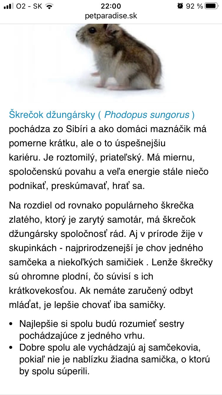 @senta_sofia to je hlúposť, skús nájsť lepšie zdroje. Džungáre sú teritoriálne a sú schopné sa medzi sebou pozabíjať. Takto sa môže chovať škrečok Campbellov, tí sa znesú aj v pároch a skupinách rovnakého pohlavia. Ale musia to byť súrodenci a ich spoločný chov má viaceré podmienky. Napríklad sa im nesmie narušiť pachová stopa v ublikácií,lebo by sa tiež začali biť.
