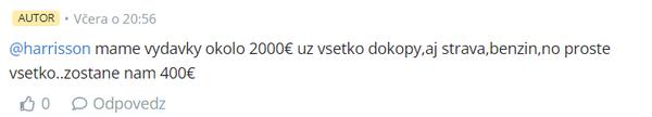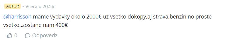 2000€vydavky tak to je naozaj vela... My mame dve deti, z toho jedno ztp kde mame kopu lekarov co je plus dalsie vydavky(nafta,liecenia) atd prijem dokopy s rodicakom aj s bonusom na dieta je 2100€, z toho mame vydavky 850€ je to slabsie ale da sa vyzit, popritom este prerabame a danove odkladam na horsie casy...niekedy aj carujem 😜🤷.. v pohode by ste vysli no len znizit tie vydavky,neda sa nijako ?
