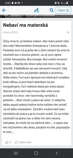 A k tomu príspevku, čo ste mi poslali. Ja vám môžem poslať konverzáciu s blízkymi a kamarátkami. Jedna sa sťažuje na rozdiel 1r9m, druha na 2,5ročný, tretia na 4ročný. Suseda minule spustila story, aké je to hrozné, že 6 rokov čakali na druhé a staršiu príchodom súrodenca zasiahol. Byť matkou je ťažké, takisto všetko závisí od detičiek, a teda vôbec by som sa na to nepozerala cez vekový rozdiel. Naša nemá ešte ani rok, začína chodiť, prespí celú noc, spapa uplne všetko, miluje iné deti, veľa s nami cestuje, vydrží aj so starými rodičmi.. Ja sa fakt nemôžem na materskú sťažovať.