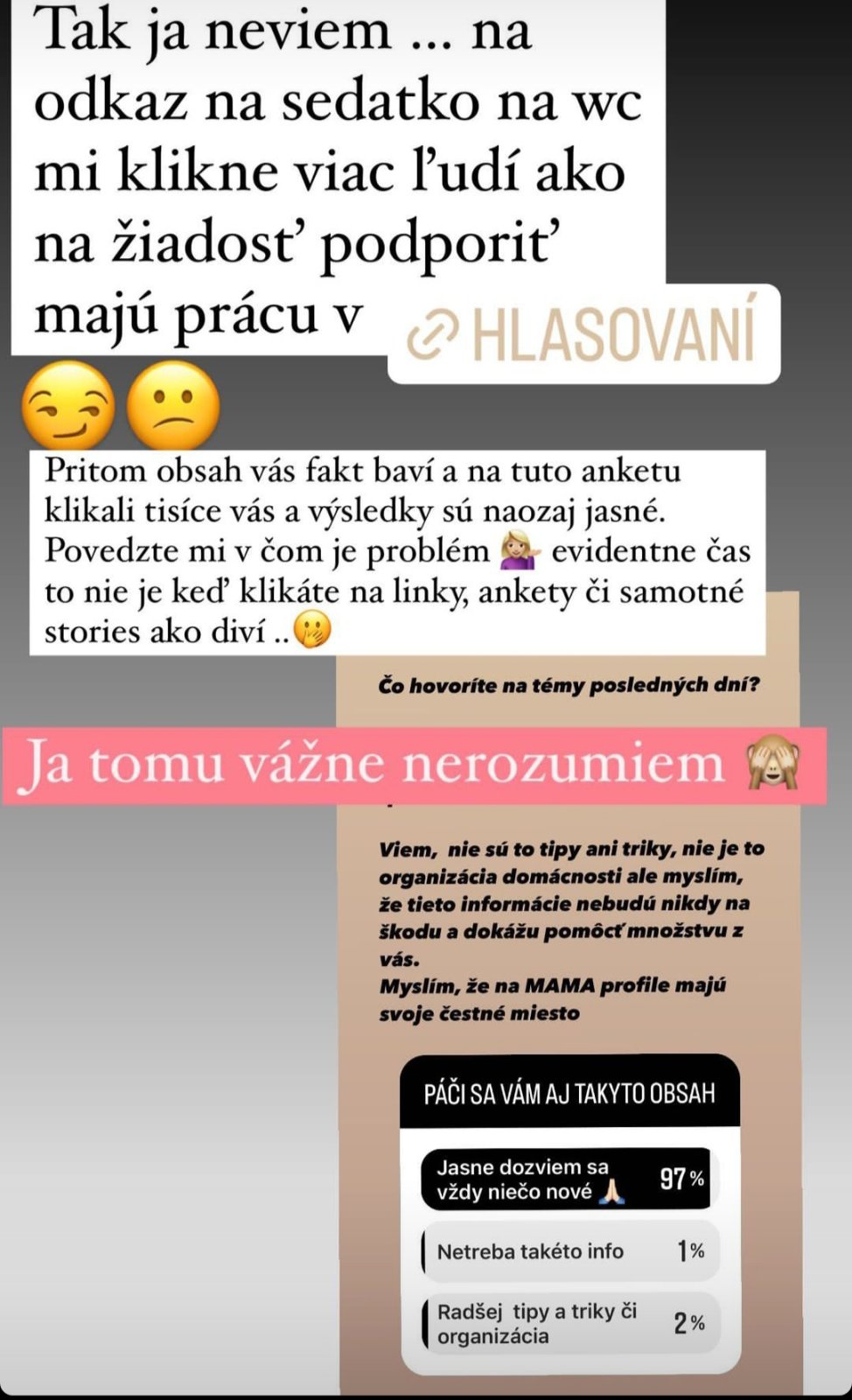 @katuskamala1 stale su zeny ktore si naozaj vedia zorganizovat zivot, a to ze daju na hodinu babke, neznamena ze maju opatrovatelku. Opatrovatelka je platena praca, nedava im ju lebo si ide na nechty, ci ku kadernicke, ci ide na cely den na welnes s kamoskami je to babka a dedo. Su zeny ktore si to zorganizovat vedia a na IG by boli za naozaj realne tip top zienky domace, ale oni sa radsej venuju inemu ako sa ukazovat pred celym svetom. Ako bolo trendy ukazovat ako sa tip-top, tak potom bolo trendy ukazovat ake je materstvo zlozite a tehotenstvo je tazke. Tak teraz je top ukazovat, ako vsetky cvicia, chodia po vyletoch a ich muzi sa nepozeraju po inych. No presne taka co zacinala s IG medzi prvymi ma toho muza, ktoreho stale vychvaluje do nebies, ale ked ona tehotna sa otocila chytal za rite ine. Ig je iluzia, aj ti co ukazovali niekedy realitu s tym prestali, ked zacali na tom viac zarabat, lebo vedia co na ich uctoch zaraba a ostatok je uplne zbytocne tam davat, lebo ked to potom nepozru ludia, zacnu ich preskakovat lebo ich to nezaujima a nakoniec im to kazi algoritmi.