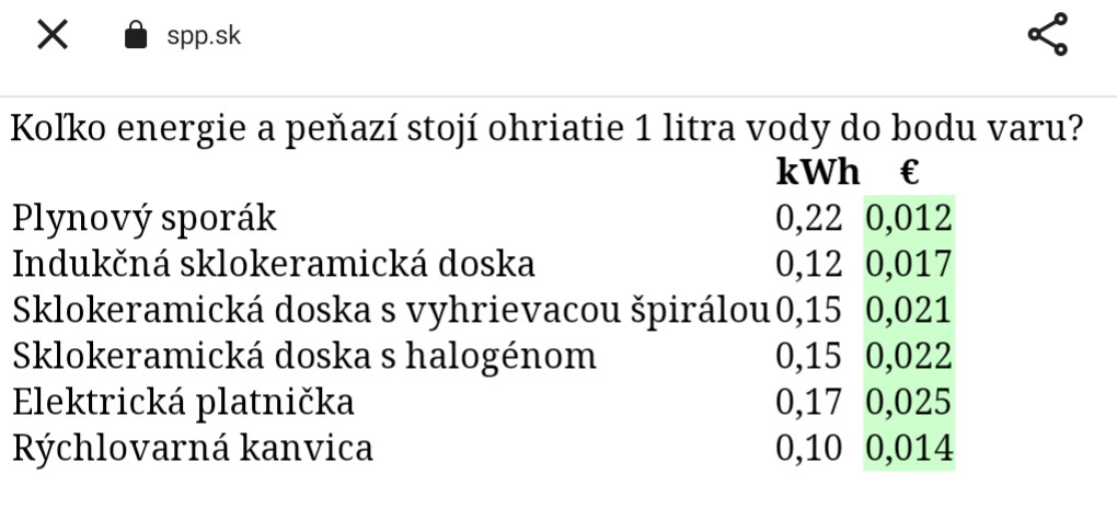 Ahojte, mali ste pravdu s tou kanvicou, nasla som takuto tabulku na spp. Povodny zavadzajuci prispevok som zmazala. Kazdopadne, vzhladom na ceny elektriny sa to na plyne viac oplati. Ale teraz pojde hore aj plyn, tak to uz ani srnka netusi ;)