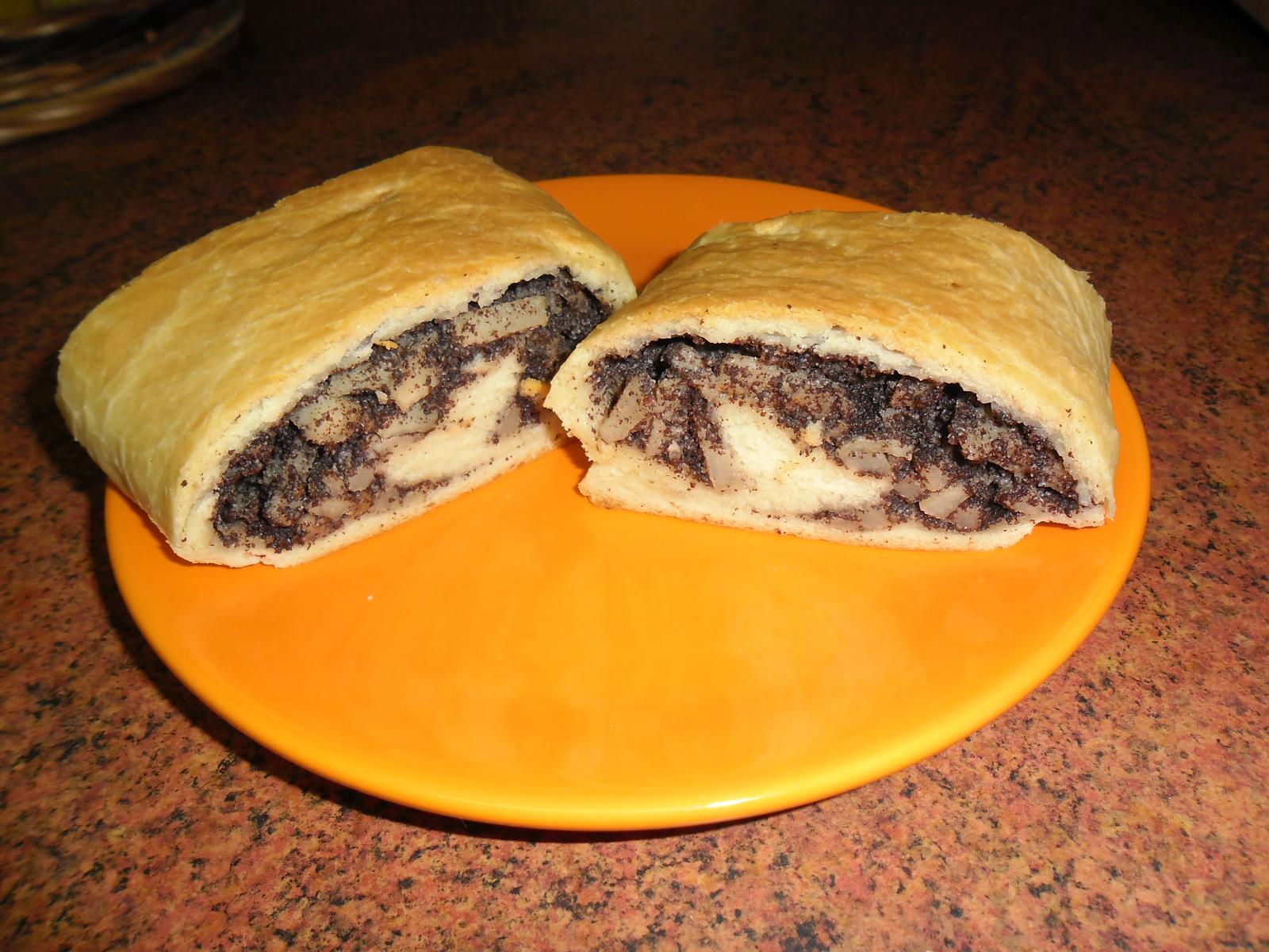 Vykynuté těsto si rozdělíme na poloviny a znovu promísíme rukama. Potom je rozválíme do tvaru obdélníku a naneseme na každý půlku náplně /ne úplně až po okraj/. Okraje ohneme dovnitř.