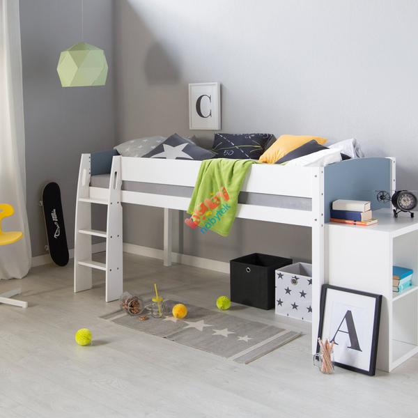 My máme niečo takéto. 90x200, nožičky sa dajú skrátiť, takže až bude dieťa väčšie, dá sa z toho spraviť bežná tínedžerská posteľ. Šetrí to miesto, dole máme police s hračkami. Muž hore radšej nelezie, ale ja tam bežne ležím a posteľ stabilne stojí. Ak v noci potrebujeme ísť za dieťaťom, nie je problém naň dosiahnuť aj keď stojíme vedla postele. Syn tam spí od troch rokov.