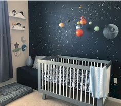 Stena pomalovana ako hviezdna obloha alebo vesmir s planetami