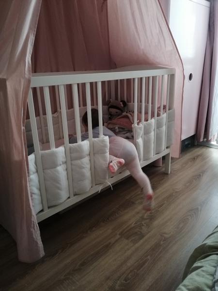 Až neskôr keď sa začne v postieľke hýbať sme mali tenký penový mantinel, aby sa neudierala o postieľku a nezasekla si nohu medzi tie paličky na postieľke