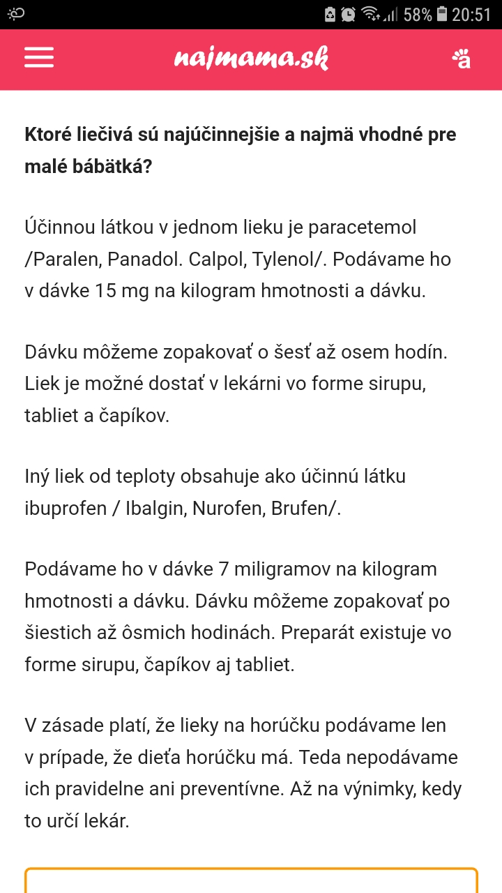 @3107199222 ked je uz vysoka teplota od 39, davaj aj zabaly ale len okolo telicka, ziadne na ruky ci nohy, to moze sposobit periferny sok! niektore mamicky tak robia, a nerobia dobre. ja som davala plienku namocenu v studenej vode, a na to suchy uterak,aby mohla lezat na postielke, aby to slo od podpazuch a po pupcek. nizsie nie, aby zas nemala mocove cesty. zabal daj na 15 minut, potom 5 minut pauza, a takto daj 3 serie. teplota by mala klesnut o par stupnov. a na teploty lepsie zaberaju cipky, ale striedaj, najprv paralenovy a uz po 2 hodinach mozes dat nurofenovy (ibuprofen). rozdiel medzi kazdym paralenom je 6 hodin a taktiez aj medzi nurofenom, cize ked podas napr. o 10.00 paralen, o 12.00 daj nurofen, potom zas o 16.00 paralen, o 18.00 nurofen. nech pije vela tekutin - cajik, vodicku, alebo dzusik, do jedla netreba nutit..... pridaj vitamin c - cebion