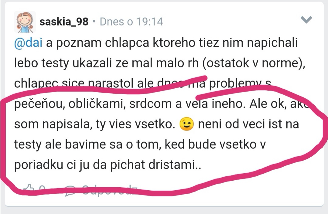 @saskia_98 ty si fakt není nenormálne jesitna🙂 namiesto toho aby si uznala že len kecas a nič nevieš tak tu budeš ďalej vypisovať... Pozri sa moja milá do skupiny kde sa združujú mamy naozaj malych deti (co mimochodom mamička zakladateľka tejto témy už spravila a dostala reálne odporúčania co robiť a ako na tom sú... A nie neboj, nikto jej nekázal pichať hormon🙂) čo by mnohé dali zato ak by riešenie bolo... Ty fakt nemáš páru aký zložitý proces je zacanie pichať Rh? 🙂 ty si myslíš ze nabehnes k lekárovi, povieš ze tvoje decko je malé, tak šup dajte hormón? A oni dajú? Bez poriadnej indikácie a zvazenia za a proti, pričom za jasne vyhráva, ti nikto žiaden hormón nedá! Takže kľudne ďalej vypisuj tvoje mudrosti:( chcela by som ta vidieť ako na všetko kašleš keby tvoja dcéra mala v 12tich 120-130cm... Ale jasne, veľká frajerka keď nič riešiť nemusíš...