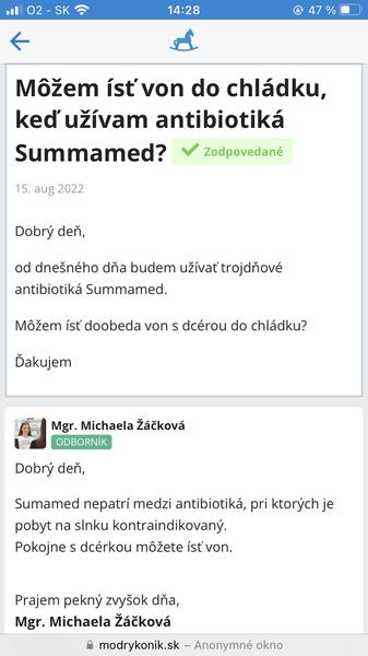 So sumamedom praveze pobyt na slnku zakazany nie je, urcite by som to neprehanala s nebola niekolko hodin vkuse na slnku, ale dieta nemusi byt ani zalezene doma. Slnenie je zakazane pri ciprofloxacine, doxy a tetracyklinoch. Ale vacsina lekarov by vam slnko zakazala pausalne pri kazdom atb, tak ako zakazuju aj mlieko, hoci to tiez nie je nutne pri kazdom atb 😬