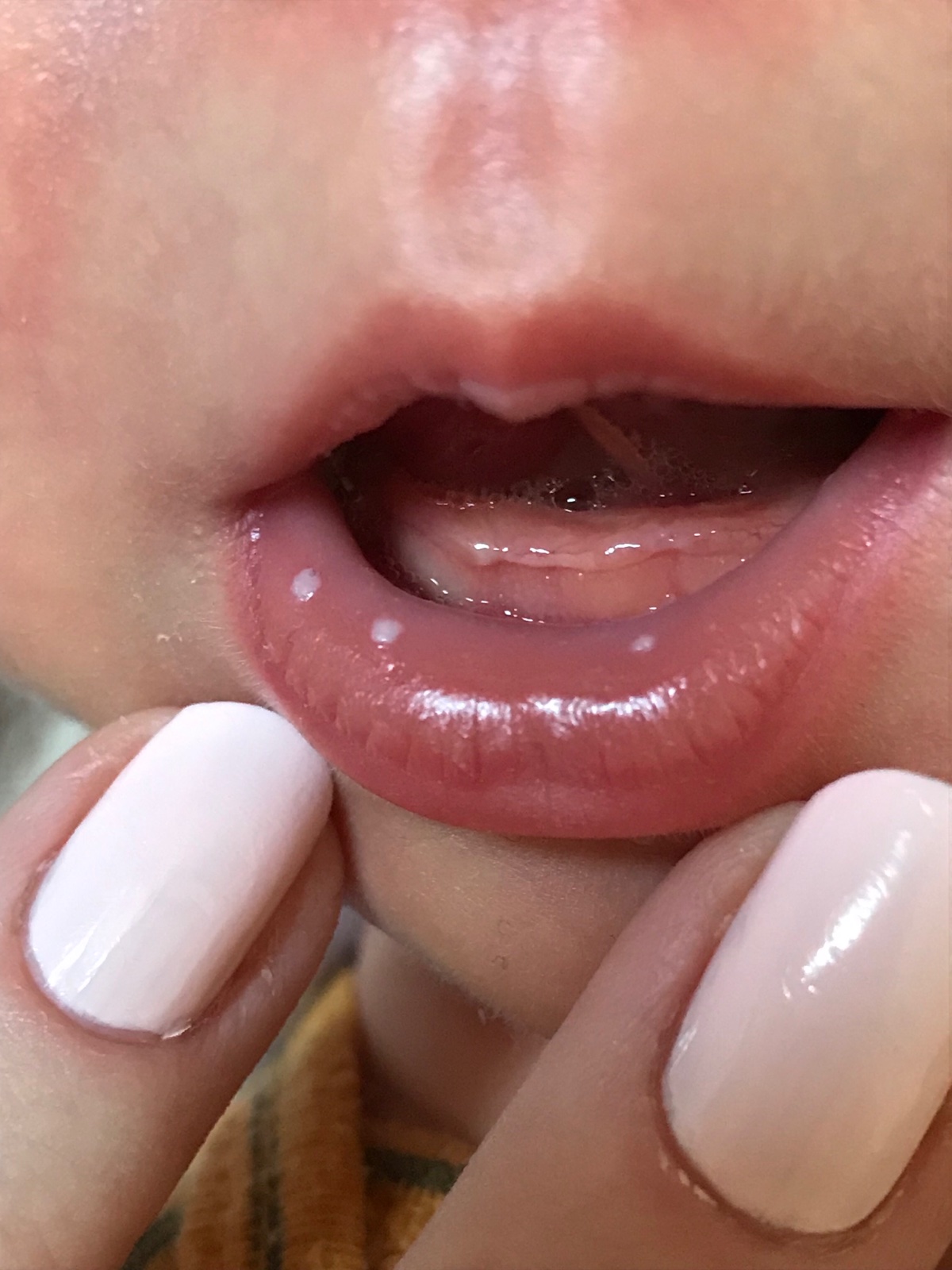 Toto mala dcéra keď mala 4 mesiace. Bol to soor. Doktor mi to kázal vytierať genciánovou violeťou. Po 3 dňoch bol pokoj.