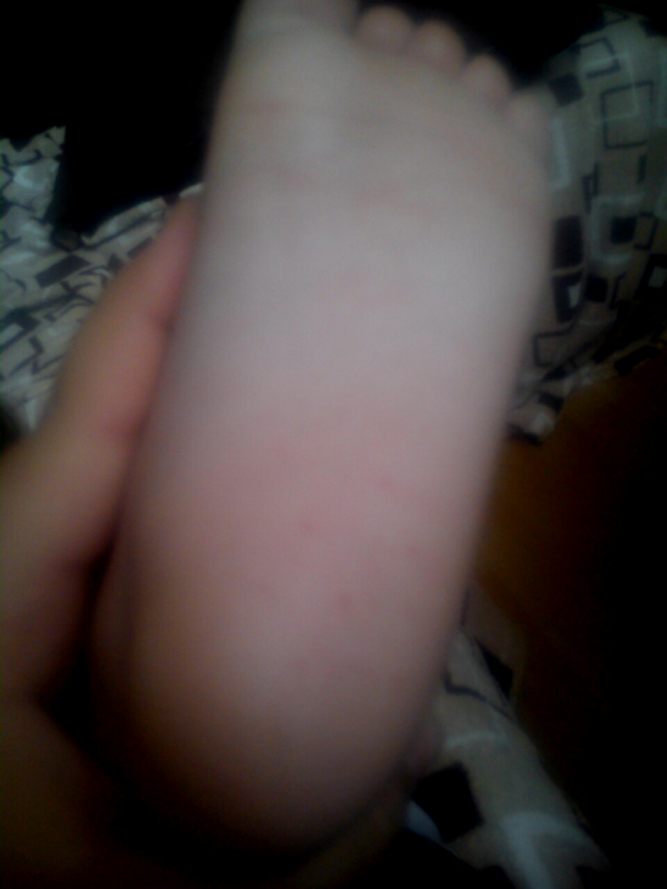 Malá má červené bodky na oby dvoch pätičkach. Minulý týždeň som si to všimla na jednej, myslela som si ze asi mala kamienok v topanocke. Nevenovala som tomu žiadnu pozornosť. Ono to vyzerá ako keby to mala otlacene od kamienkov alebo niečoho. Ale nemá to mať od čoho odtlacene keďže iba teraz vstala a má to na oby dvoch nozickach. Co to môže byť?