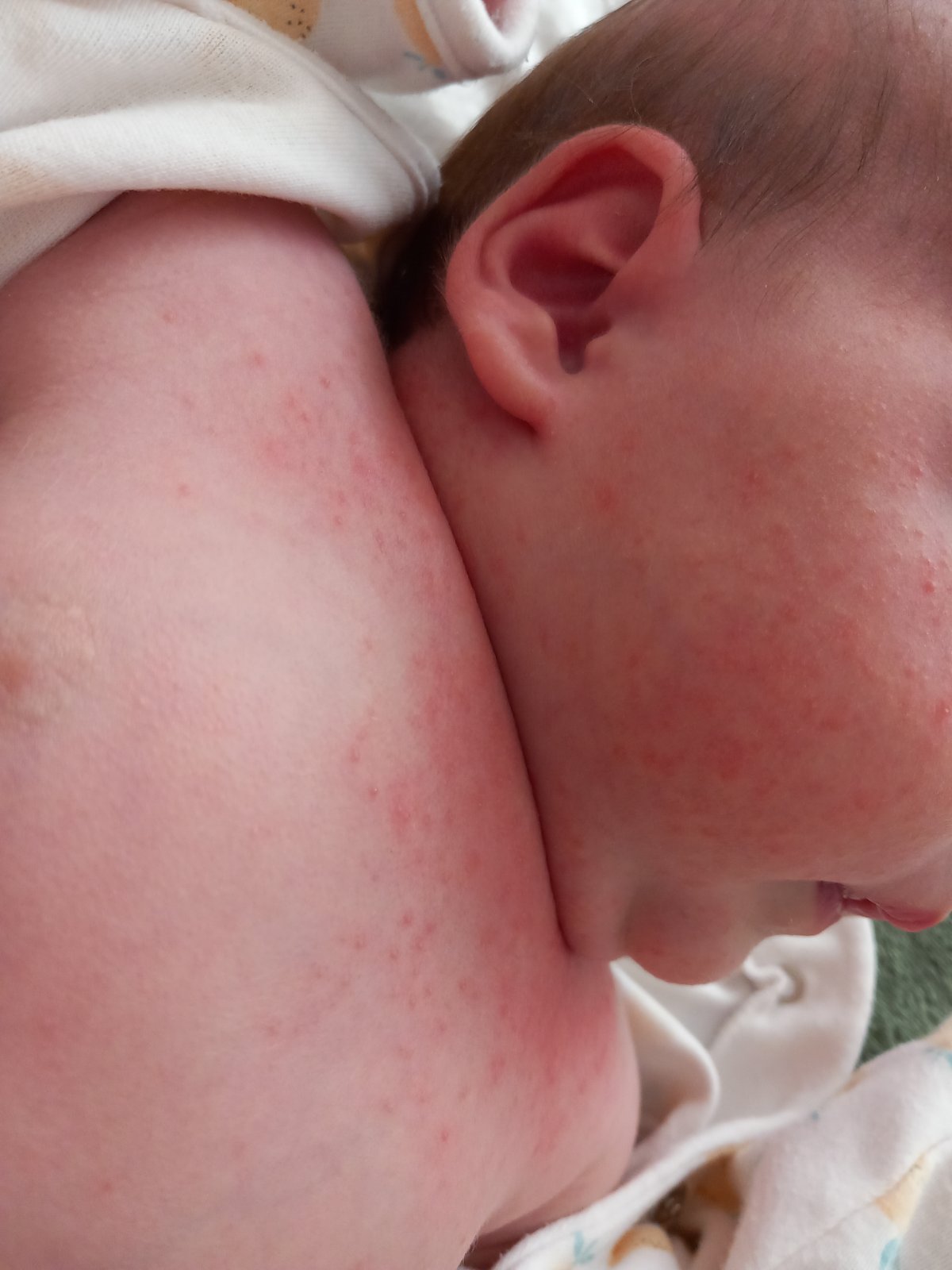 Vyzera to trochu ako alergia ale nevyznam sa... Ak nema ziadne ine problemy isla by som s nou v pondelok k doktorke.