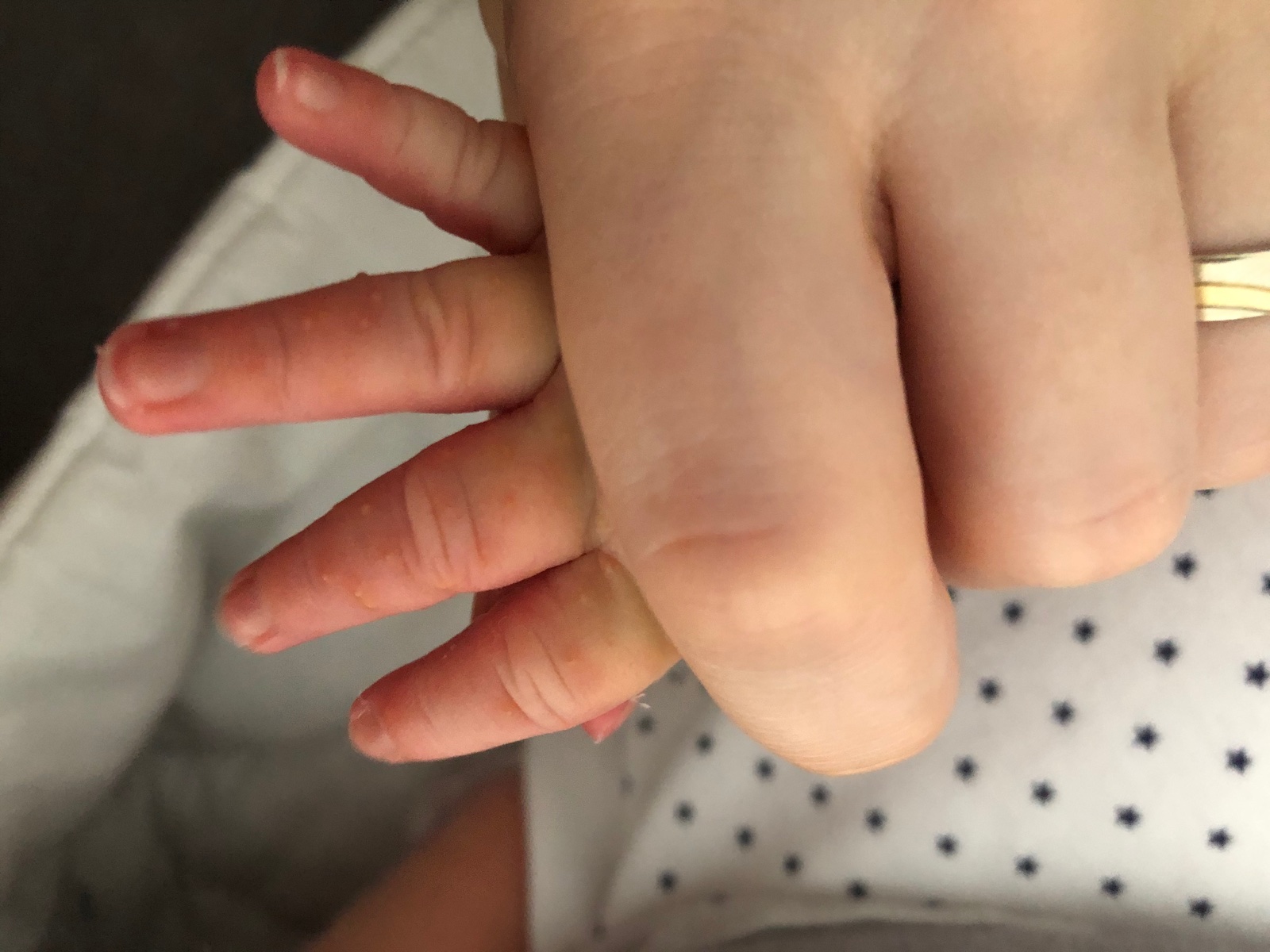 Taketo vyrazky sa objavili u mojho dvojryzdnoveho babatka, plne dojceny. Ma ich iba na prstekoch oboch ruk. Samozrejme, budeme kontaktovat lekarku. Neviete, co to moze byt? Tu take drobne, akoby naplnene nejakou tekutinou.