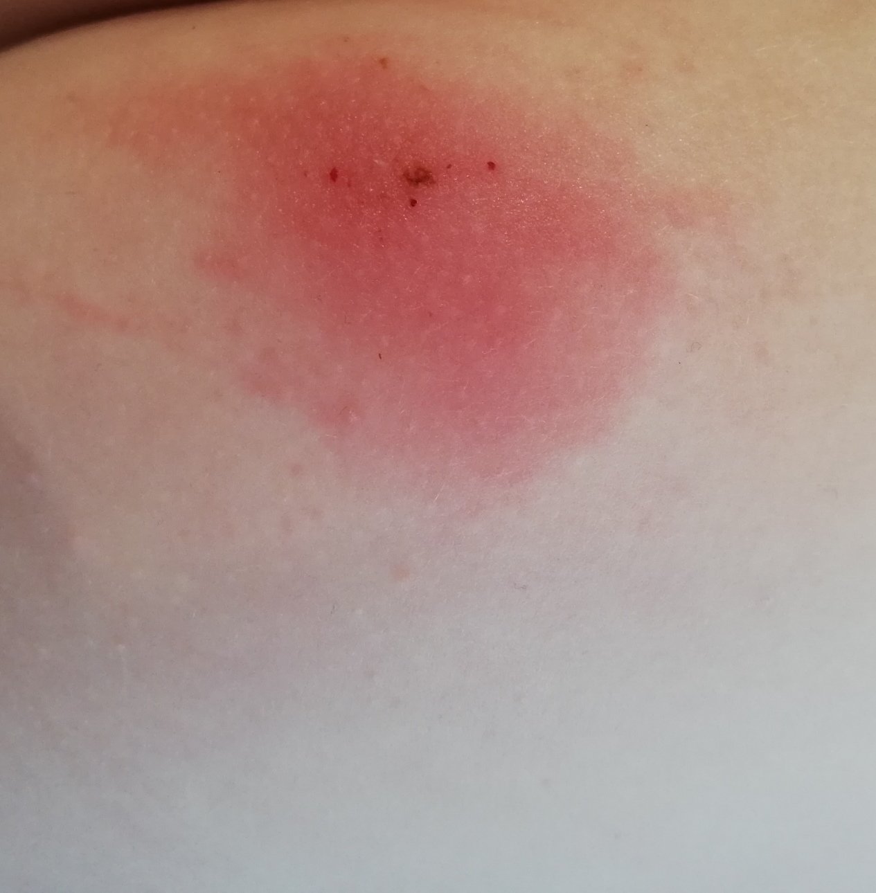 ja si tiez myslim ze to bude uhryznute = pretoze v strede ma krvavu bodku. Skus natriet fenistilom - malo by to mat okamzity ucinok.